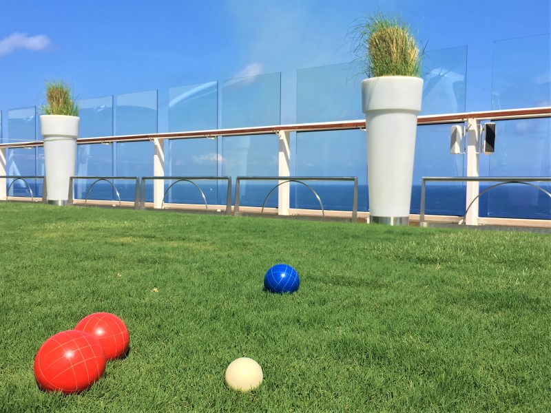 The Grassy Lawn on Celebrity Equinox, Deck 15 with bocce balls in the foreground