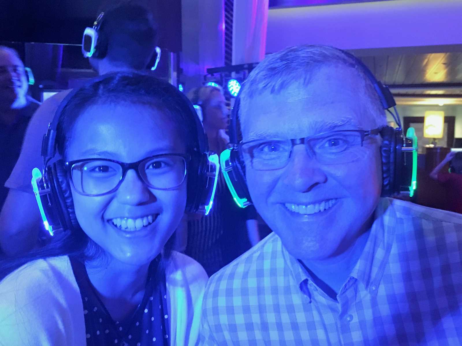 Wearing the special headphones for Silent Disco on Celebrity