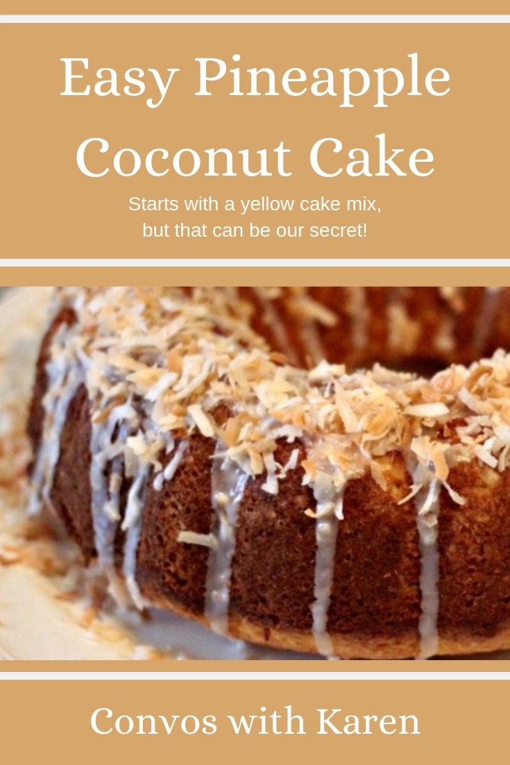 So, when making recipes using cake mix, I prefer cakes with pudding in the mix. They’re a little richer to start, making them taste even more homemade. As to this pineapple coconut cake, I like to bake it in a bundt cake pan. It’s such a delightful presentation, but you can make it in a 13X9 pan.